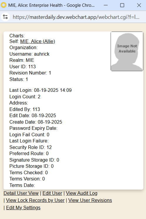 - The logged in user’s name and security role will display to the right of the person icon. If the logged in user has access to edit user profiles, the name becomes a clickable link that takes the end user to the user account information.
