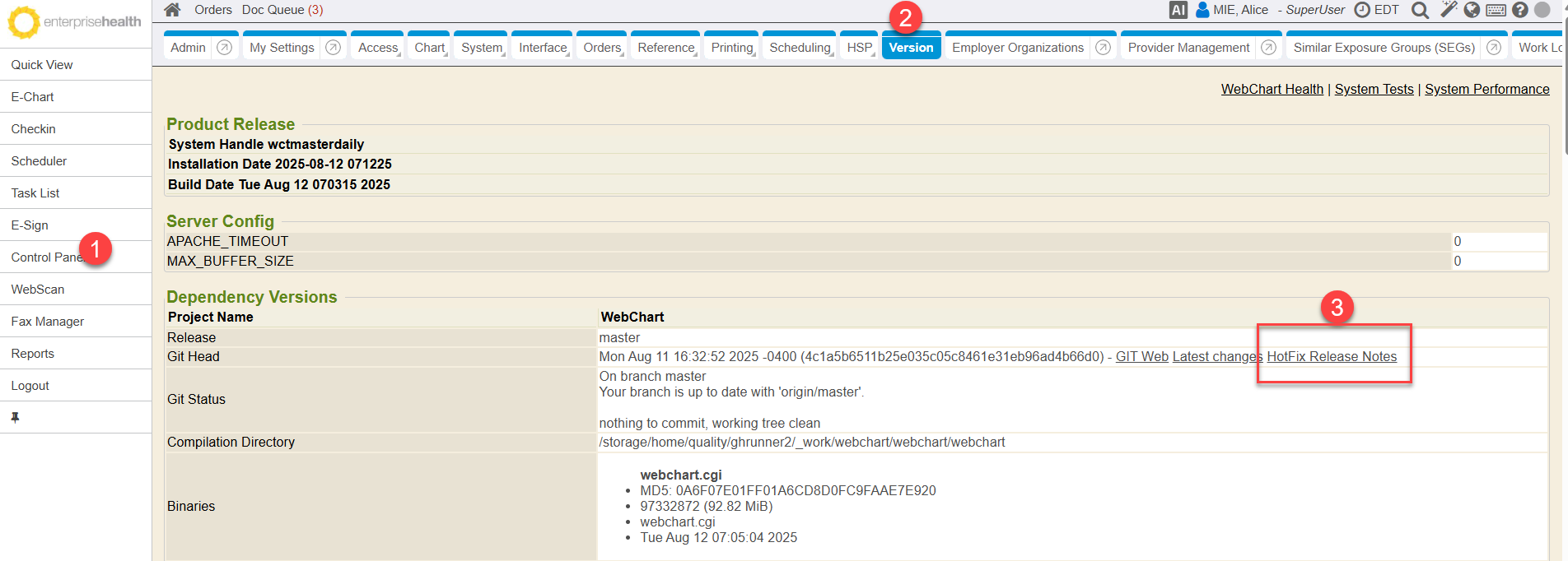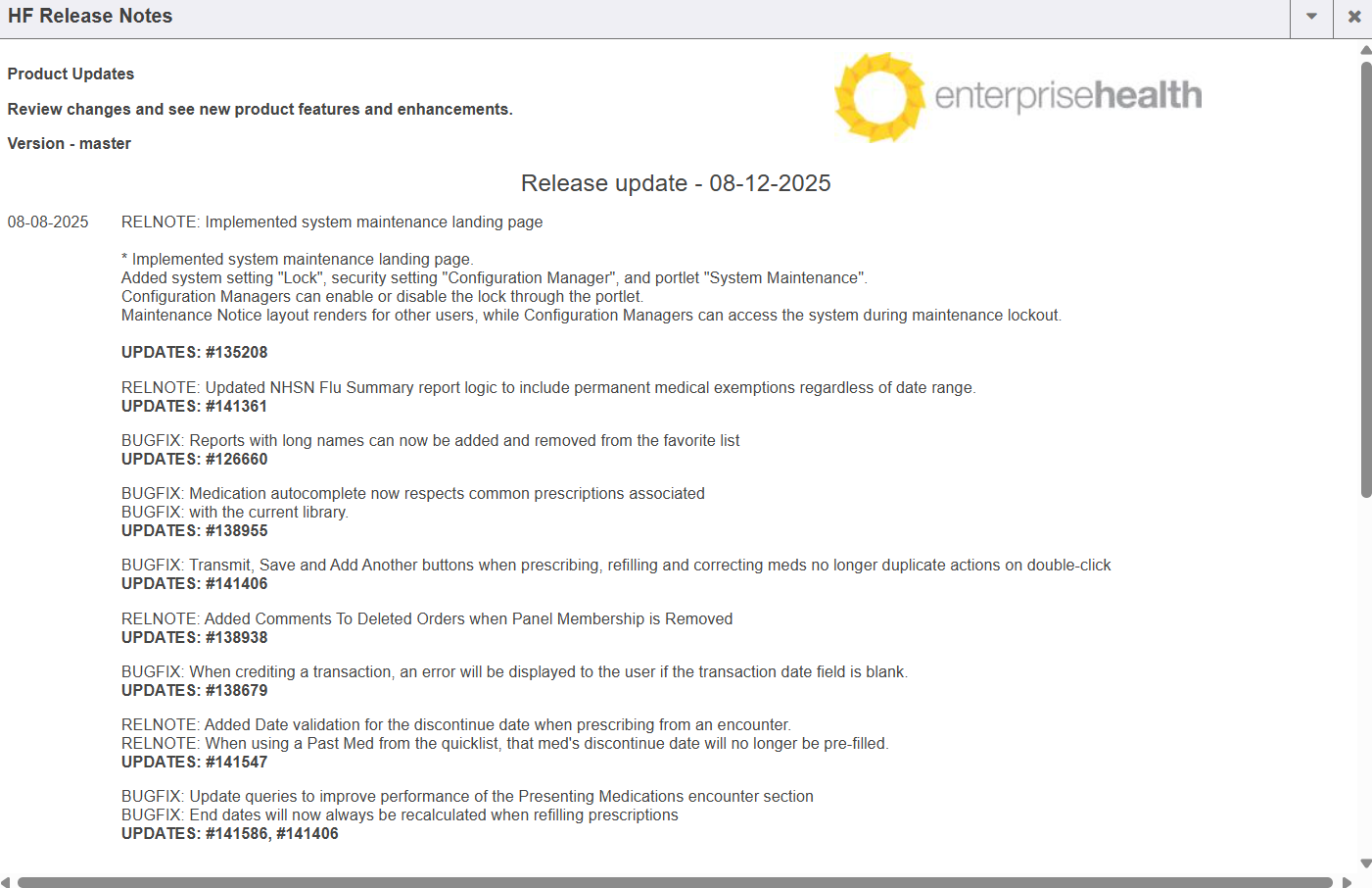 Hotfix Release Notes are available on the Version tab (Control Panel->Version). Release Notes will continue to be emailed to System Administrators on the hotfix notes email distribution list. If the Version tab does not display in your database, please contact your implementer for assistance installing it.